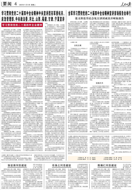 新華社北京11月3日電 (記者梅常偉)中央宣講團成員、中共中央政治局委員、中央軍委副主席張又俠3日在軍委機關作黨的二十屆四中全會精神宣講報告。 張又俠緊扣宣講主題,結合軍隊實際,對全會精神作了系統闡釋和深入解讀。他指出,一定要深刻領悟貫徹習主席重要講話和規劃建議部署,自覺用全會精神統一思想行動、引…[詳細]