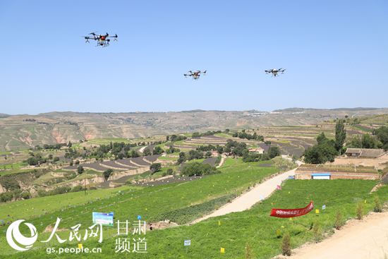 中藥材種植試驗田無人機噴藥現場。(魏怡 攝)
