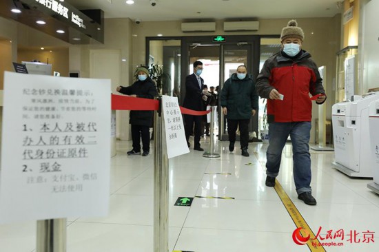 上午九點,中國銀行北京金臺路支行一開門,市民進入兌換紀念鈔。人民網 尹星云攝
