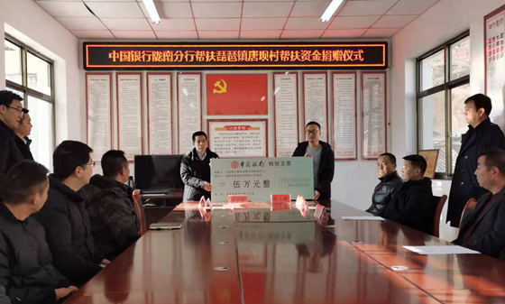 近日,中國銀行隴南分行在隴南市武都區琵琶鎮唐壩村舉行幫扶資金捐贈活動,向唐壩村捐贈5萬元幫扶資金作為鄉村亮化項目。捐贈儀式上,唐壩村專職書記黃義輝就隴南分行近年來對唐壩村的真情幫扶表示衷心感謝,并對本村當前發展基本情況、存在的問題及下一步的發展計劃進行了匯報交流。