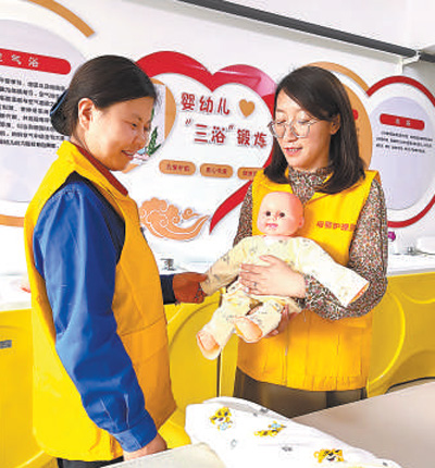 趙振香(右)在調研中為員工講解護理嬰兒技巧。本報記者 宋朝軍攝