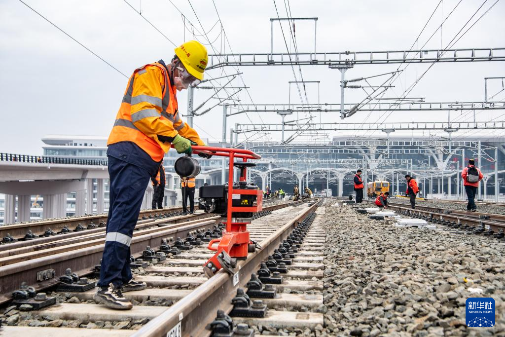 2月18日,在重慶東站建設施工現場,鐵路工人在對線路進行精調作業。