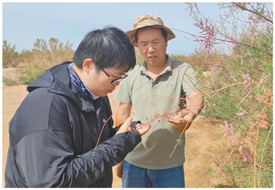馬俊河(右)和志愿者在觀察樹木生長情況。