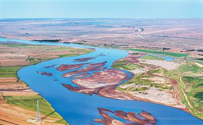 內蒙古巴彥淖爾市磴口縣劉拐沙頭,黃河兩岸顯出片片綠意。