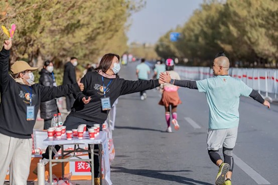 作為2025年甘肅省馬拉松賽事的收官之戰,組委會精心籌備,科學設置沿途補給站,能量膠、鹽丸、飲用水等物資充足。賽道沿線,熱情的敦煌市民自發組成助威團加油吶喊,并自發組織敦煌樂舞表演,讓跑者在奔跑中感受“飛天起舞,樂聲盈耳”的文化魅力。